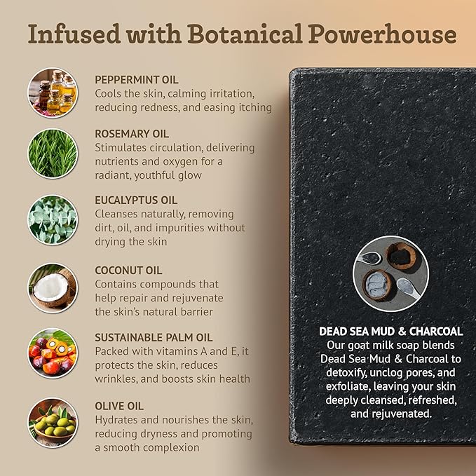 - FRESH CLEAN FEEL WITHOUT HARMFUL INGREDIENTS - Olive Oil, Coconut Oil, Sustainable Palm Oil, Activated Coconut Charcoal, Dead Sea Mineral Mud, Goat Milk, Peppermint, Rosemary and Eucalyptus Essential Oils