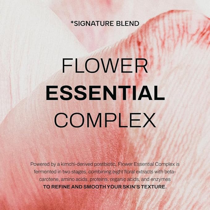 - FLOWER FERMENTATION ENERGY: Powered by a kimchi-derived postbiotic, our double fermented Flower Essential Complex merges eight floral extracts with beta-carotene, amino acids, proteins, organic acids, and enzymes to refine and smooth your skin’s texture.
