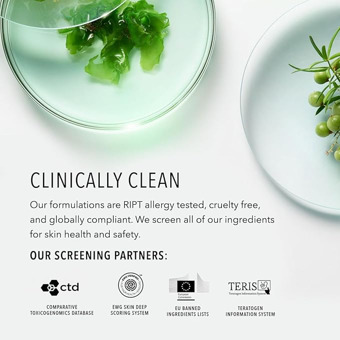 - Clinically Clean: Free from genotoxins, parabens, phthalates, sulfates, and harmful fragrance. Our formulations are RIPT allergy tested, cruelty free, & globally compliant. We screen all of our ingredients for skin health & safety