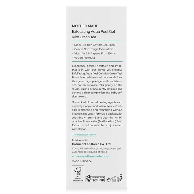 - Super Gentle Exfoliation To Skin - Unlike harsh microdermabrasion scrubs or strong chemical acid peels that dissolve proteins, MOTHER MADE Exfoliating Aqua Peel Gel is formulated with moisture-rich cellulose fiber that softly balls up with grime only, without strong chemicals or stress to skin