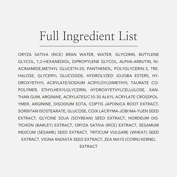 - Key Ingredients: Rice Water 68%: Moisturizing, hydration and glowing. Alpha-Albutin 2%: Radiance, dark spots, skin protection and pigmentation. Niacinamide: Skin tone, skin barrier and acne care.