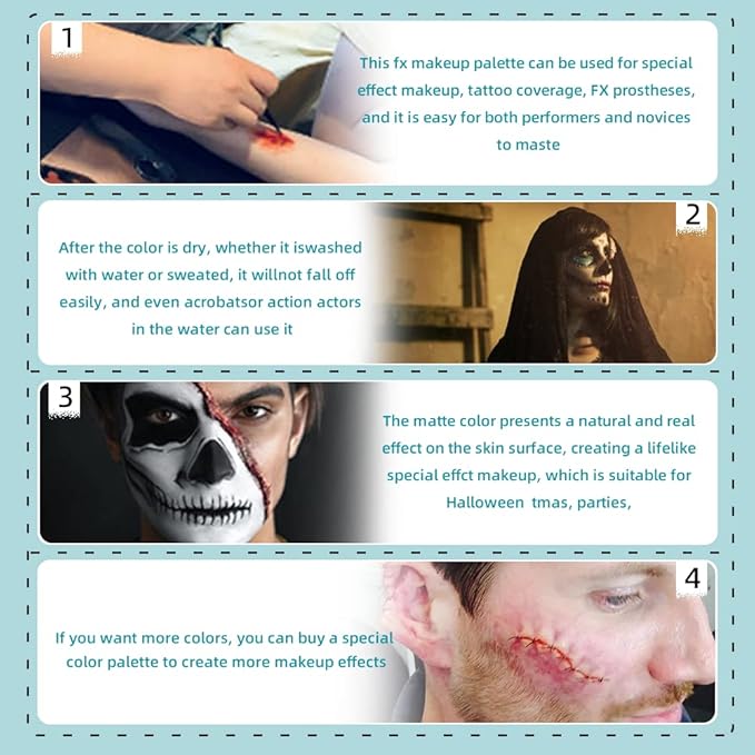 - 【Application】It can be used for special effect makeup, tattoo coverage, FX prosthesis, and it is very easy to master whether it is a performing arts worker or a makeup beginner. You only need to drop a few drops of alcohol in the paint grid before each use and wait for it to soak in, then you can paint with a paintbrush or cotton pad. After it dries, it will not fall off easily whether it is washed with water or sweated, so even in the Acrobats or action actors in the water can be used.