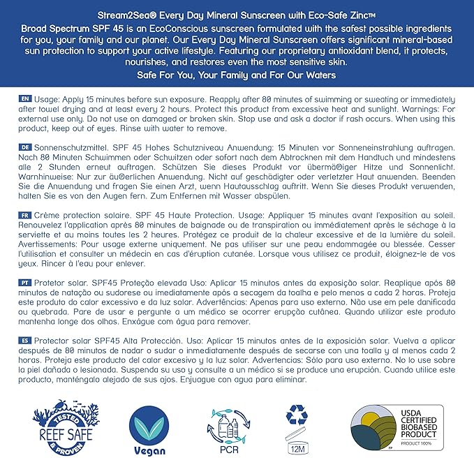 - OUR FORMULA IS REEF SAFE - Many chemical-based sunscreen are toxic to coral reefs and fish. Our product is a mineral-based, natural, eco-friendly sunscreen . This has been tested and proven safe for humans, freshwater and saltwater marine life. Even our tubes are eco-conscious - all Stream 2 Sea containers are made from Sugarcane Resin. Happy seas and happy skin indeed!