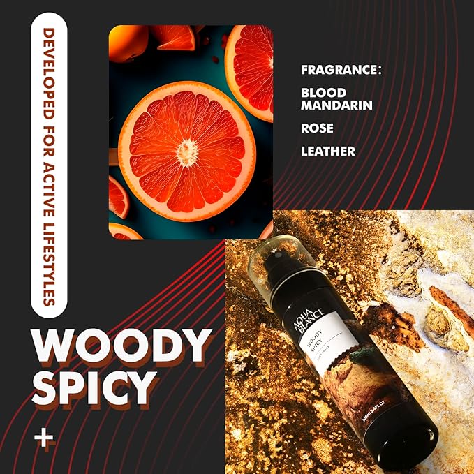 - Woody Spicy is a harmonious blend of invigorating blood mandarin and cool peppermint, which gracefully give way to a warm and spicy heart of rose and cinnamon. The base notes of leather and amber ketal lend an alluring and sensual quality to this complex and captivating fragrance.