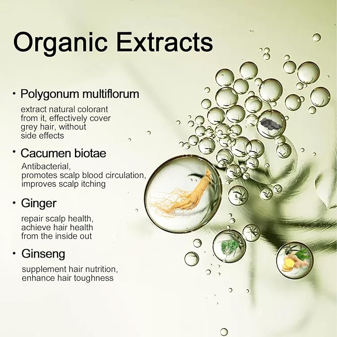 - GENTLE TO HAIR AND SCALP: The natural hair dyes are rich in plant essence, such as black sesame, polygonum multiflorum and ginseng extracts, which can make your hair feel healthy, conditioned and shiny. It is hypoallergenic and non-irritating to avoid causing any irritation or damage.