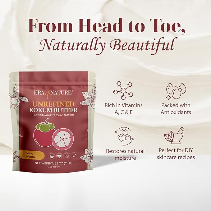 - RAW AND UNREFINED KOKUM BUTTER: era of nature kokum butter is 100% pure, firm, and scent-free—ideal for blending with raw shea butter or cocoa butter. A favorite for those creating belly butters, stretch mark creams, and deeply moisturizing body products.