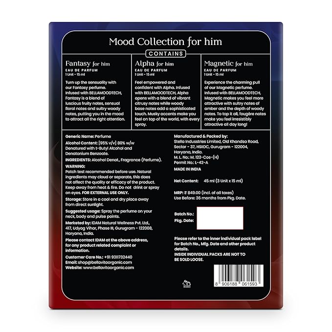 - Luxury Men's Cologne Gift Set – BellaVita Mood Collection includes three premium men’s fragrances—Alpha, Fantasy, and Magnetic. Designed for sophistication and style, this mini perfume set is ideal for personal use or gifting. Whether you're dressing up for an event or need a fresh daily scent, this mens cologne gift set ensures you smell amazing and feel confident all day long.